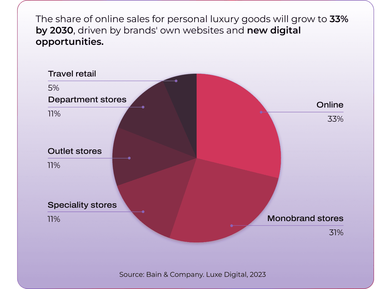 The role of online luxury shopping is becoming increasingly important in the overall customer journey, with projections indicating that it will become the dominant sales channel in the near future, surpassing monobrand retail stores. Bain & Company X Luxe Digital 2023 study shows that online sales for personal luxury goods are expected to account for 33% of the market by 2030, driven in part by brands' own websites and emerging digital opportunities.